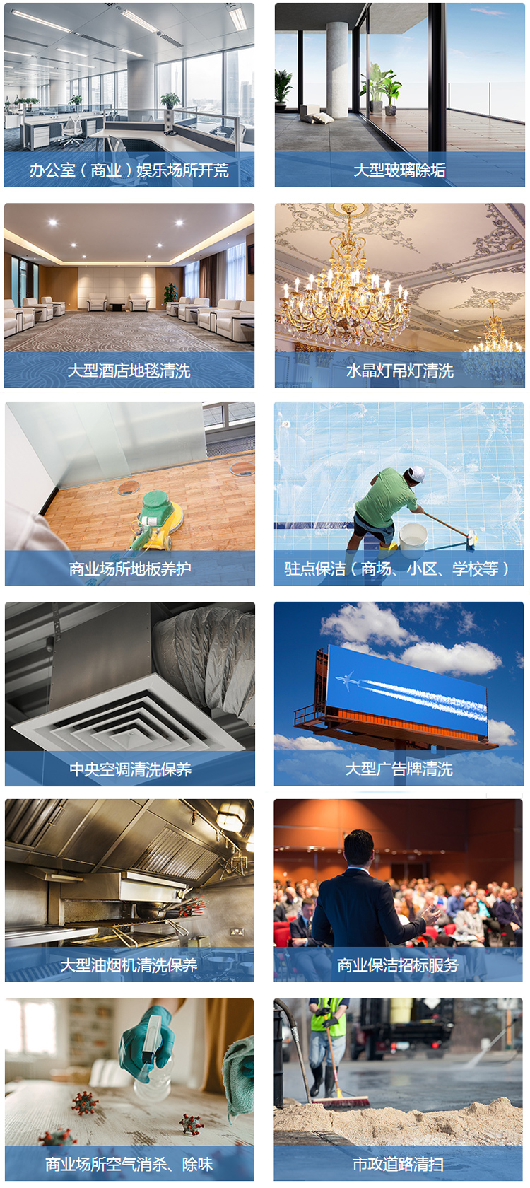 商業(yè)工程服務(wù)項目包含:辦公室娛樂產(chǎn)所等開荒保潔、大型玻璃除垢、中央空調(diào)清洗、大型油煙機清洗、大型廣告牌以及市政道路清掃服務(wù)等等。