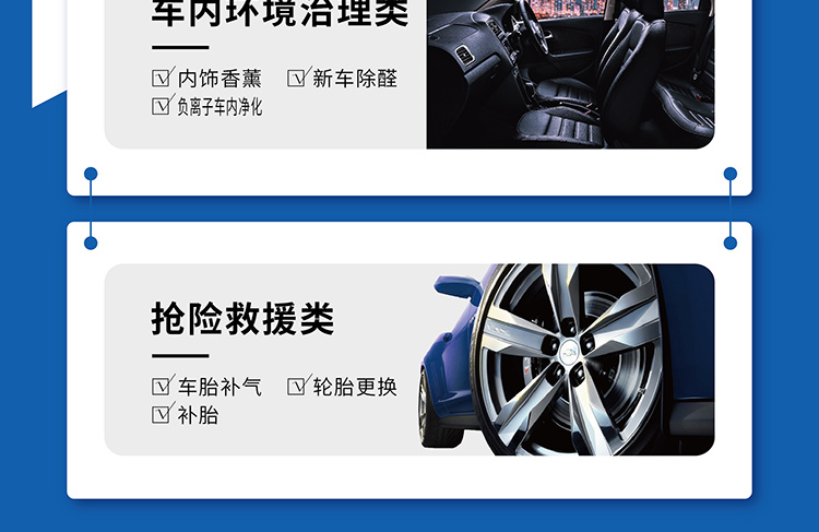 服務(wù)包括清洗類(桑拿洗車、內(nèi)飾精洗、空調(diào)清洗、輪轂除銹、發(fā)動(dòng)機(jī)清洗)、美容類(車漆美白、玻璃翻新、玻璃鍍膜、小劃痕去除、打蠟、鍍晶)、車內(nèi)環(huán)境治理類(內(nèi)飾香薰、新車除醛、負(fù)離子車內(nèi)凈化)、搶險(xiǎn)救援類(車胎補(bǔ)氣、輪胎更換、補(bǔ)胎)等。